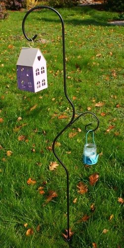Metalowy wieszak ogrodowy o wysokości 130 cm, przeznaczony do powieszenia lampionów, latarenek lub lekkich dekoracji świetlnych. Konstrukcja zakończona spiralą tworzy bezpieczny haczyk, z którego lampion nie zsunie się pod wpływem wiatru.