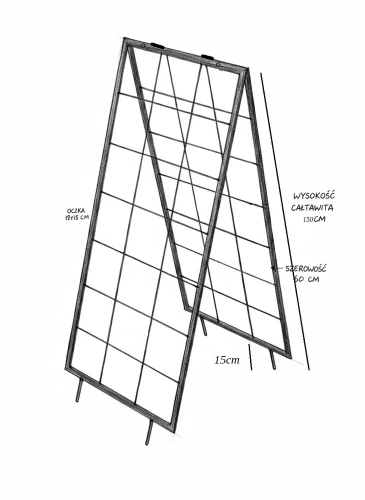 Każda kratownica ma wysokość całkowitą 150 cm, z czego 135 cm pozostaje nad powierzchnią ziemi po wbiciu podpory. Szerokość elementu wynosi do 60 cm, a oczka mają około 18 × 18 cm. Stabilność zapewnia solidny pręt o średnicy 6 mm oraz rama z profilu 20 × 20 mm.